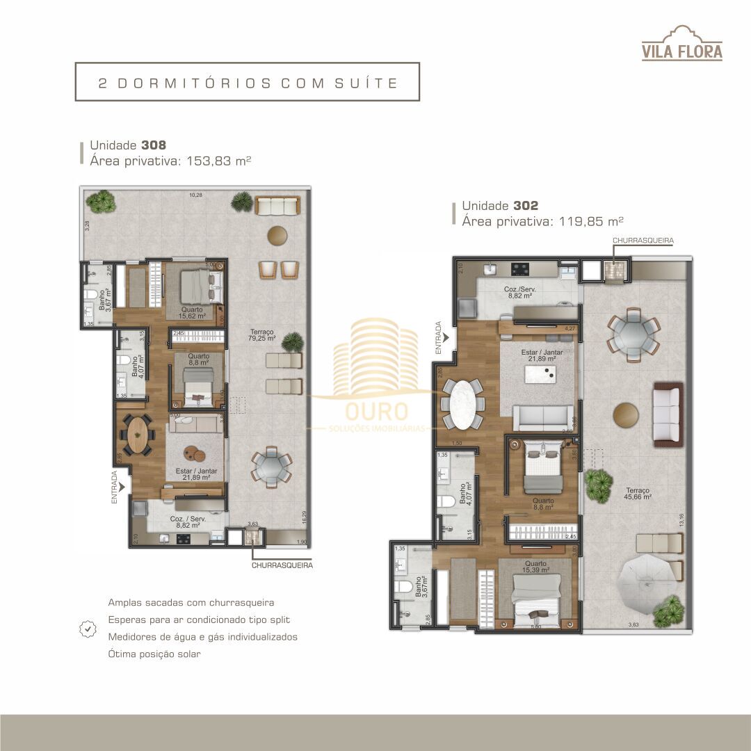 O empreendimento também conta com apartamentos com amplos terraços, para quem gosta de áreas externas.