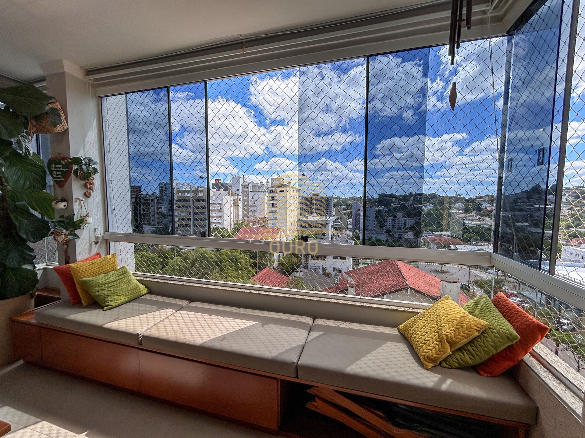 - Sacada fechada em vidro com cortinas instaladas.